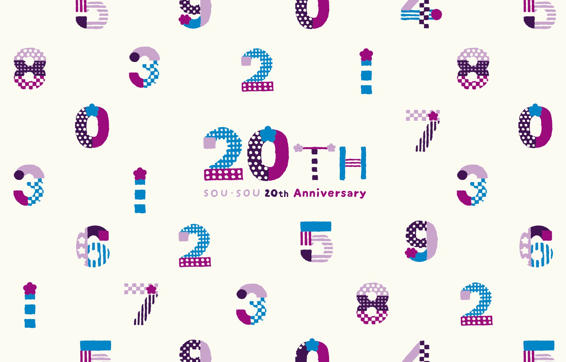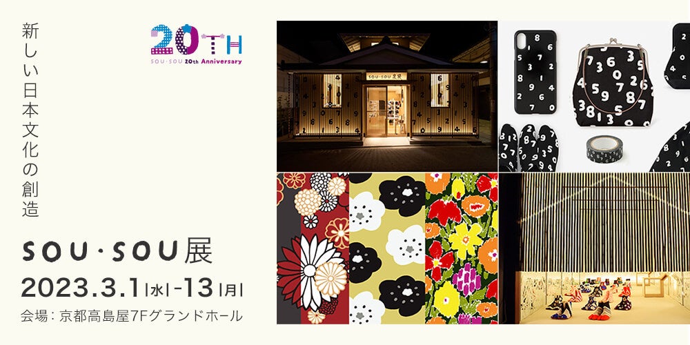 京都のテキスタイルブランド「SOU・SOU」(代表取締役:若林剛之)は、おかげさまで、2023年3月8日に創業20周年を迎えます。これを記念して、京都高島屋7階グランドホールにて、創業から今日までの歩みと日々の仕事をご紹介する展示「20th anniversary ─新しい日本文化の創造─SOU・SOU 展」を行います。展覧会中は、江原啓之氏(作家、スピリチュアリスト)、和泉元彌氏(狂言師)、頭川展子氏(全日本きものの女王)など豪華ゲストを招いたトークイベントなども開催。また、20周年を記念し、書籍「SOU・SOU 20年のテキスタイルデザイン集」(美術出版社)の出版、20周年記念オリジナルデザイン「SO-SU-U ハレ」の新アイテムも続々発売を予定しています。