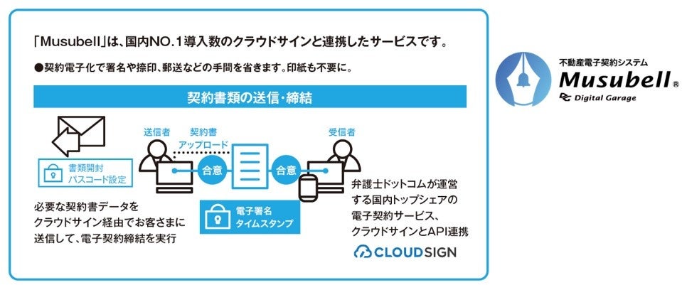 電子契約のシステムについては、株式会社デジタルガレージが開発、運営するDXクラウドサービス「Musubell」を採用しました。「Musubell」は、弁護士ドットコム株式会社が運営する電子契約サービス「クラウドサイン」とAPI連携しており、2要素認証(2つの要素を組み合わせて本人認証を行う認証方式)を必須とし、「クラウドサイン」により電子署名が付される電子契約システムです。