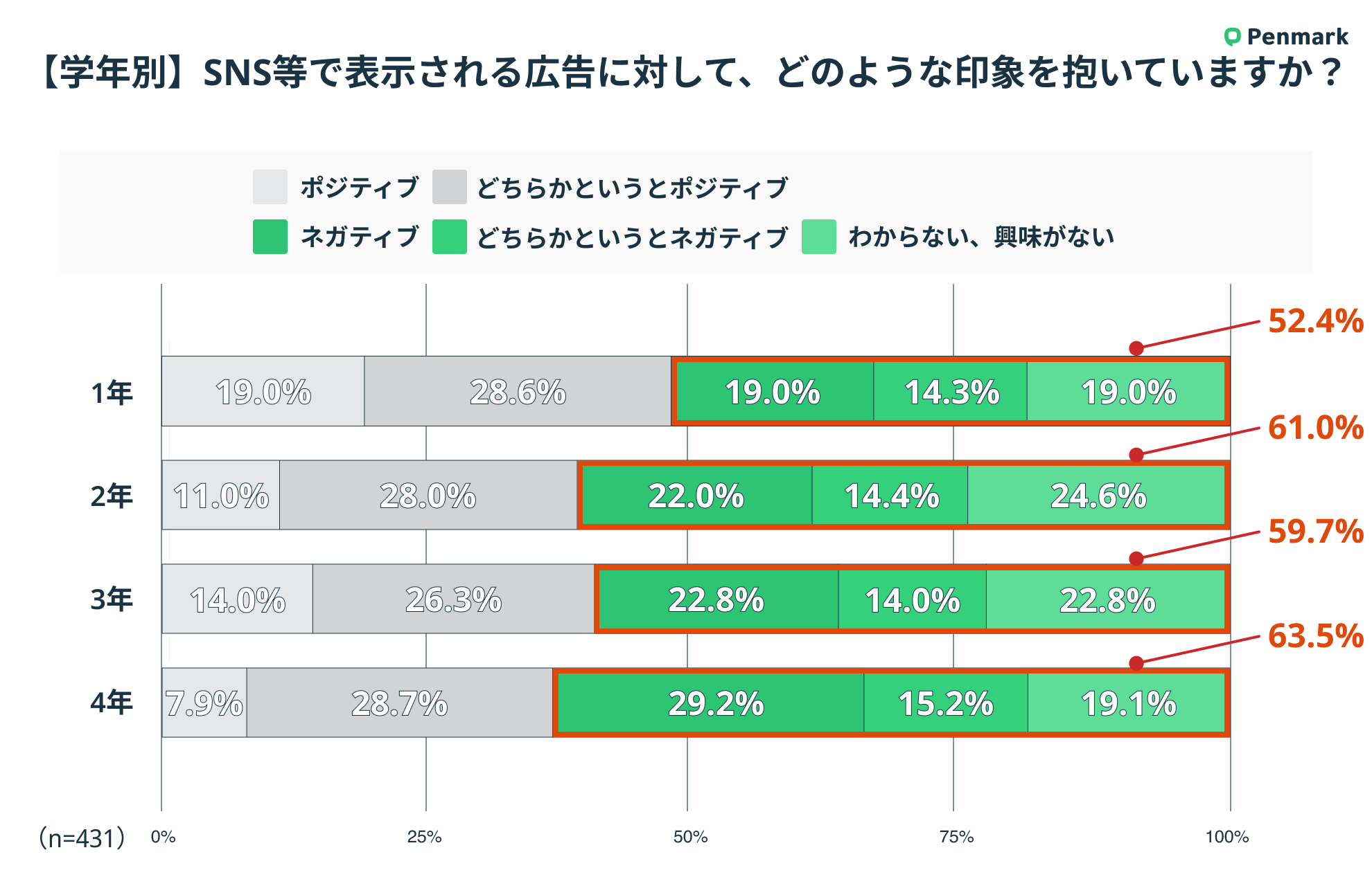 学年が上がるごとに、好意的な印象は減少する傾向が見られ、大学4年生では好意的な印象を持つ学生は36.6%と最も少ない。これは、学年が上がるにつれて情報感度が高まり、多様かつ膨大な情報から選択し判断する能力が向上するためと考えられる。また、類似した広告を繰り返し見ることで、広告に対して飽きや嫌悪感を感じるようになる可能性がある。
