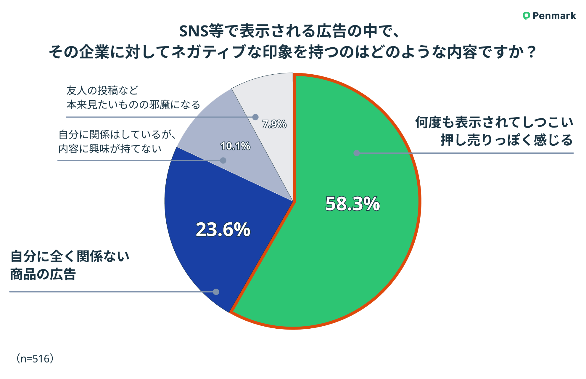 「何度も表示されてしつこく、押し売りっぽく感じる」広告を配信する企業に対し、最もネガティブな印象を抱く
