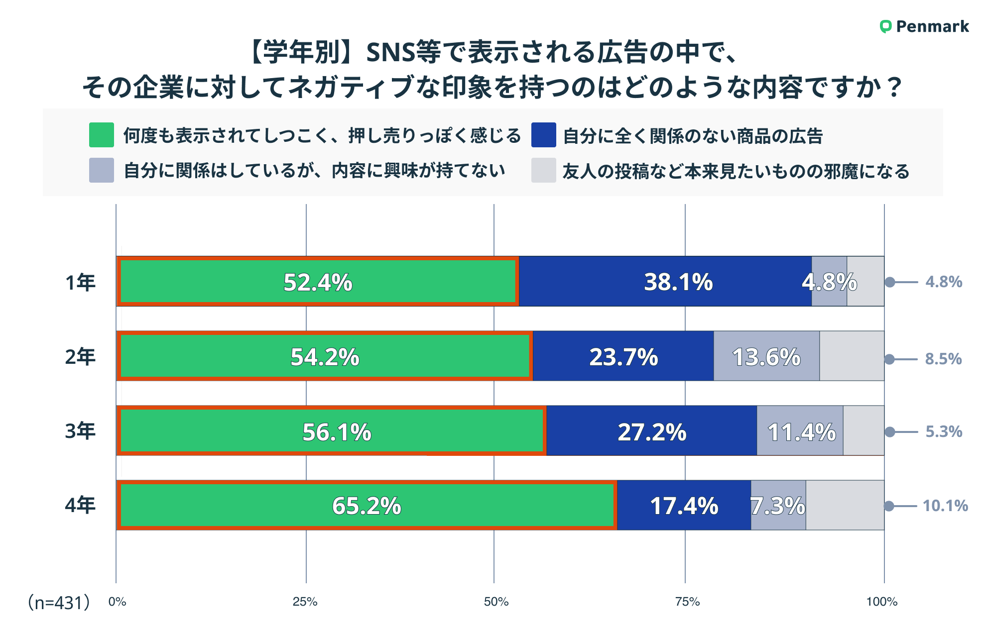 学年別では、「何度も表示されてしつこい」広告に対する不快感が最も高かったのは4年生で65.2%となっている。