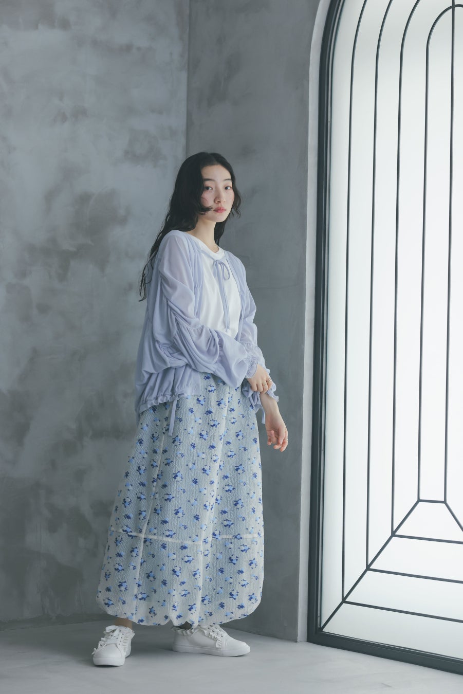 カーディガンは身頃や袖にシャーリングを入れ、くしゅっとさせたデザインがひと癖効いた一枚です。スカートは裏地のブルーがうっすら透けて見える、ほんのりとした透け感と控えめな色合いがポイントです。
