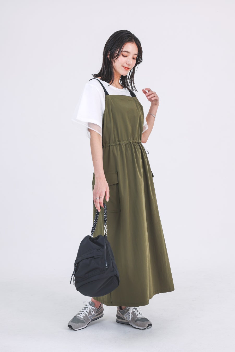 ジャンパースカートは、撥水や防汚、UVカットなど嬉しい7つの機能付きです。カットソーの上にオーガンジーが重なったレイヤード風トップスで女性らしさをプラスするのがおすすめです。