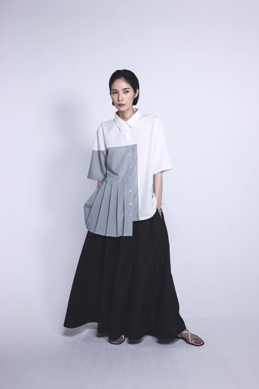 身頃のアシメに施したプリーツと配色が印象的なプリーツシャツです。ワイドパンツは袴のように裾広がりでボリューム感のあるシルエットが魅力です。