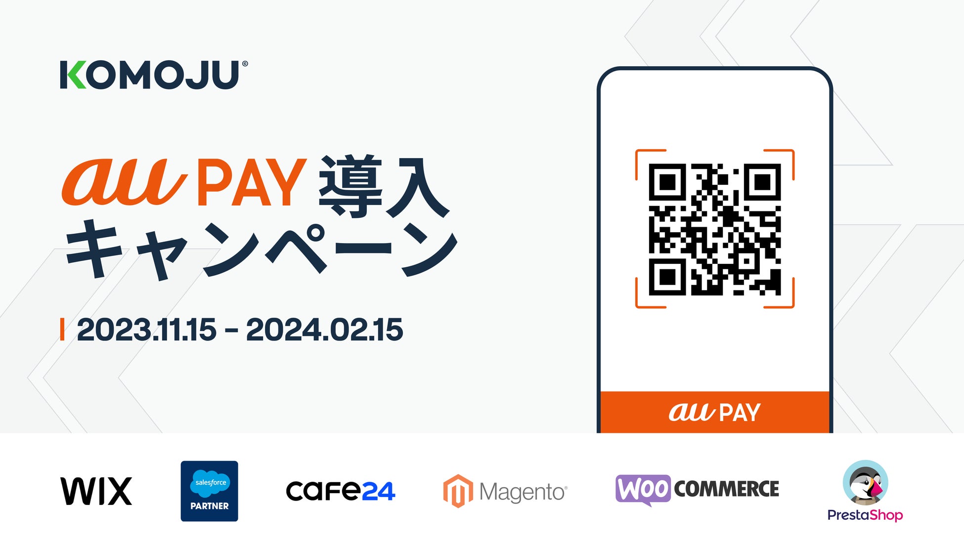 新規登録キャンペーンは、2024年2月15日までにWix.com,Salesforce Commerce Cloud, Cafe24,PrestaShop,Magento,WooCommerceを利用している事業者がKOMOJUでau PAYをお申し込みいただくと、au PAYの決済手数料が通常3.5%のところを3.3%の特別価格で永年適用されます。初期・月額費用につきましても通常通り無料となります。