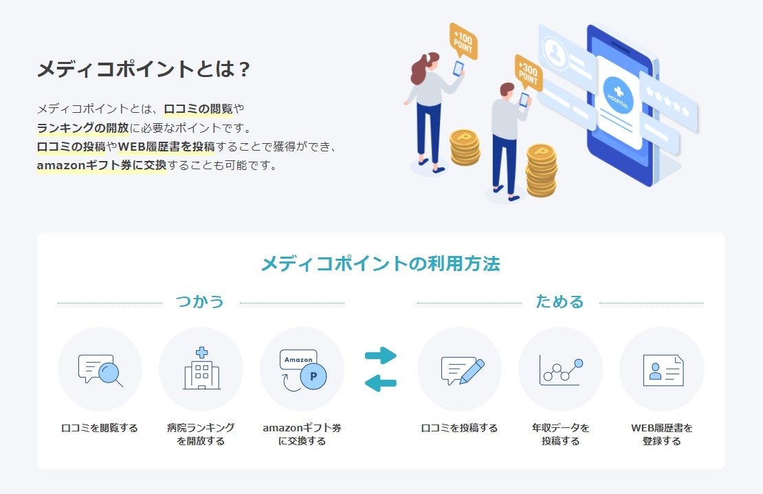 「メディコポイント」は、Amazonギフト券に交換できるほか、口コミの閲覧に利用することもできます。