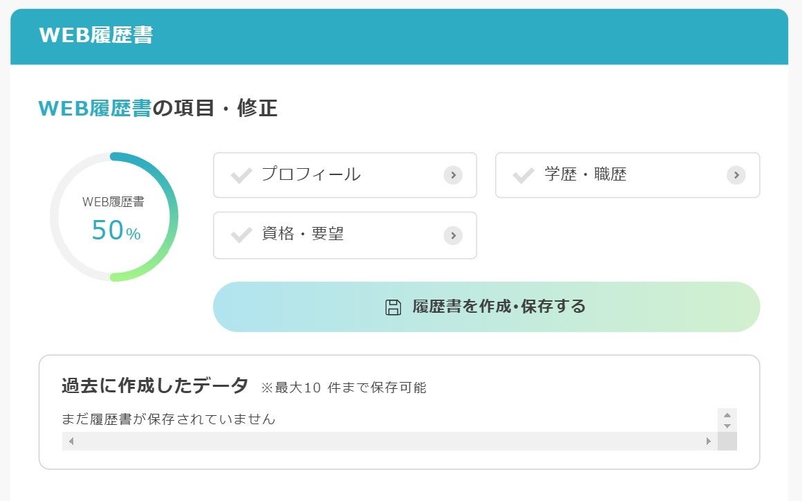 質問に回答する形式で、簡単にWEB履歴書・職務経歴書を作成することができます。