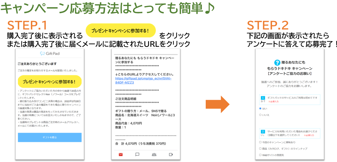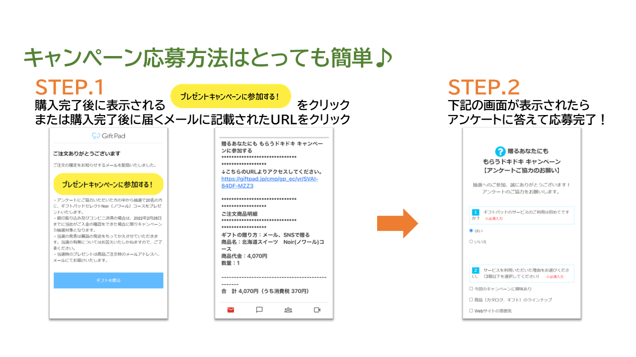 ギフトを贈るあなたにも「ギフトをもらうドキドキ」嬉しい瞬間を感じていただきたいというギフトパッドスタッフの思いから今回のキャンペーンを開催しました。期間中にギフト購入いただきアンケートに答えていただいた方の中から抽選で20名様にオンラインカタログギフトプレゼント!