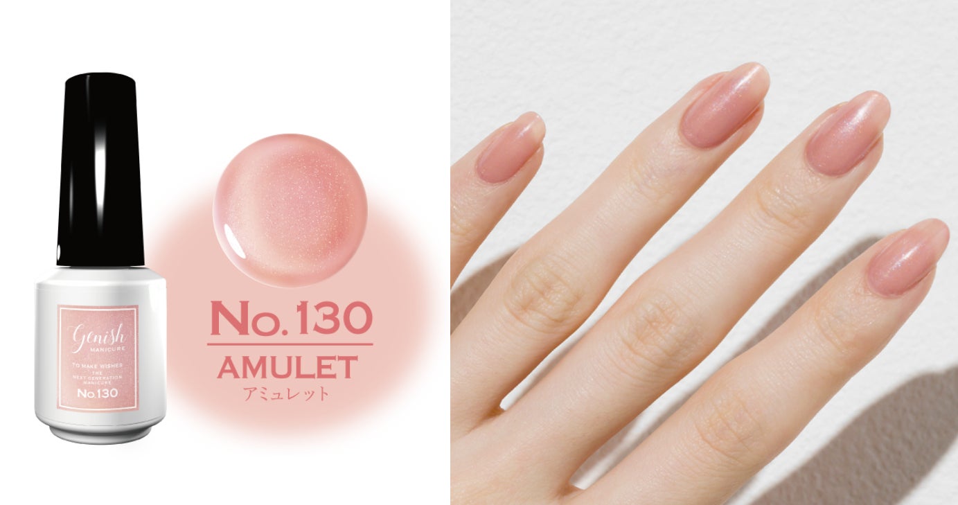 火のエレメントをイメージしたカラー「 No.130 アミュレット」は、ブルーラメが星座のようにきらめくヌーディーピンク。指先に血色感を宿す肌になじみやすいピンクで、ブルーラメとゴールドパールがきらきらと瞬きます。