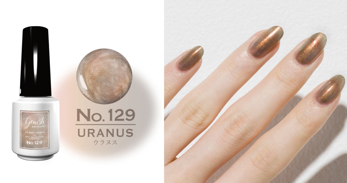 地のエレメントをイメージしたカラー「 No.129 ウラヌス」は、偏光ラメがオーロラのように輝くグレイッシュブラウン。光の角度によってレッドやグリーンに見え方が変わる華やかな偏光ラメと、透明感のあるブラウンブラックが星のような力強い輝きと儚さをを感じさせます。