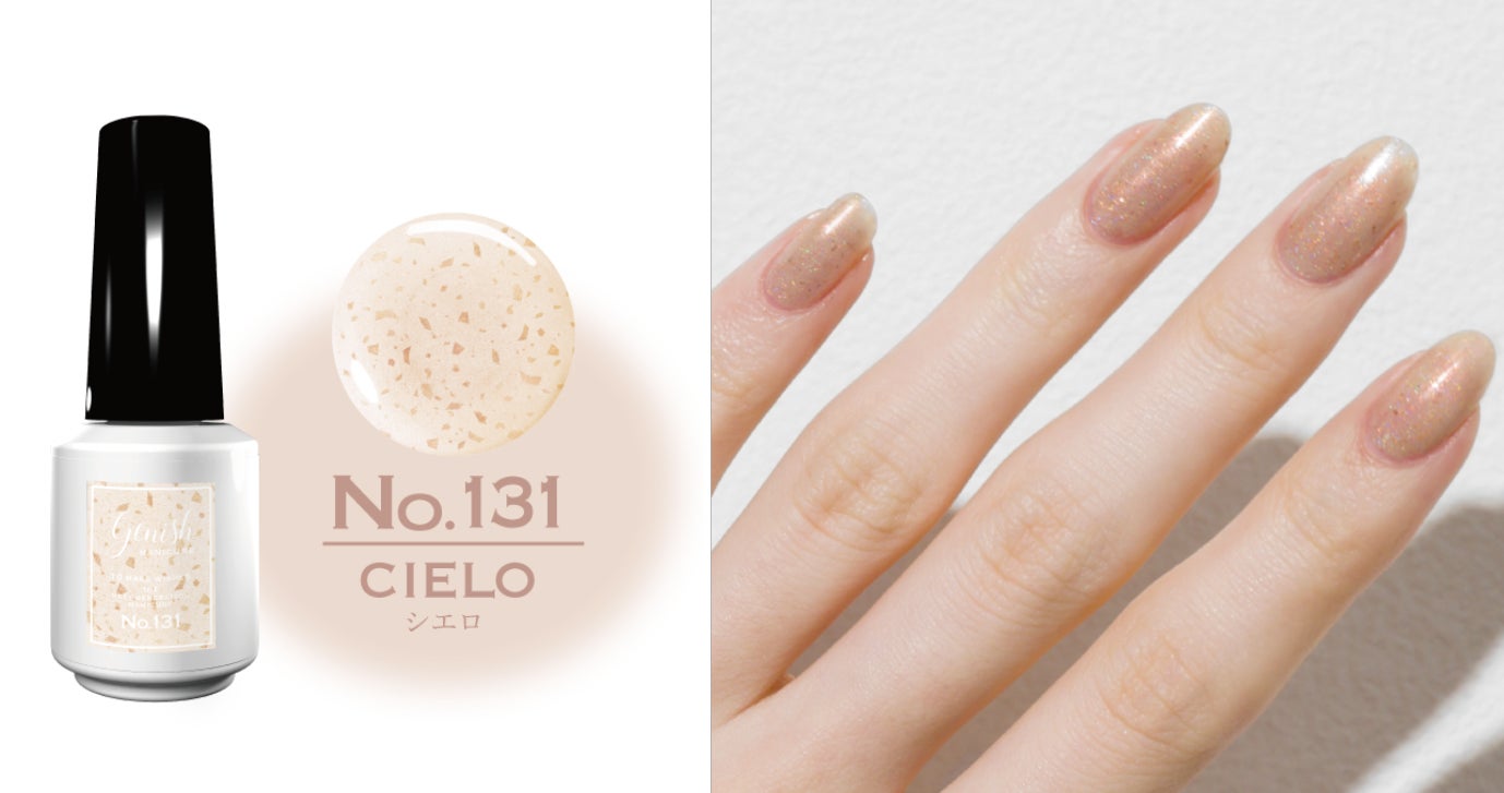 風のエレメントをイメージしたカラー「No.131 シエロ」は、星屑のようなフレークラメが光きらめく洗練されたスパークルベージュ。ホロとラメが上品に輝く、ホリデーシーズンにぴったりな指先きらめくヌーディーカラー。