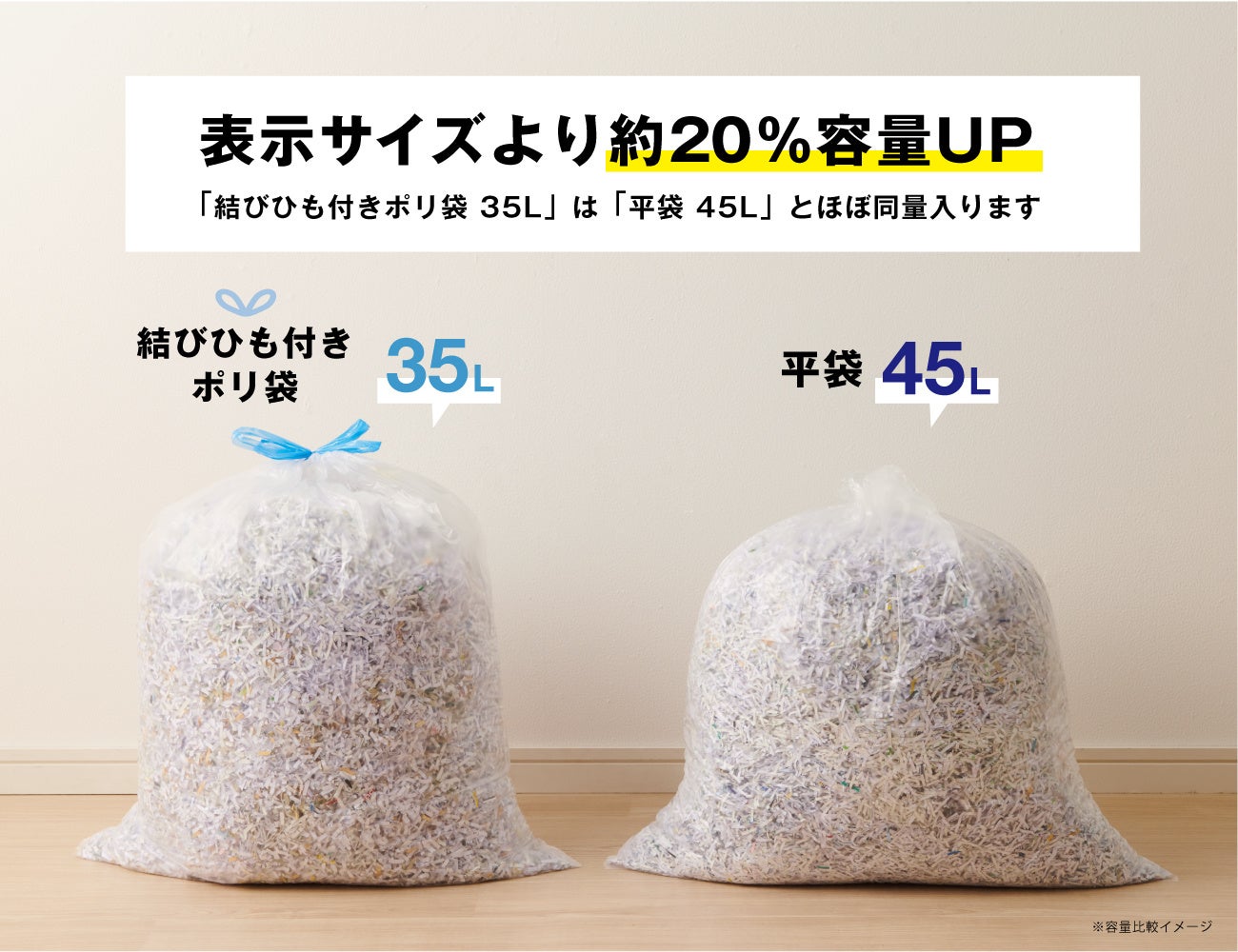 また、ひもで開口部を縛るため、ひも付きでないごみ袋と比較して、袋サイズ(リッター表記)より、約20%容量がアップします。