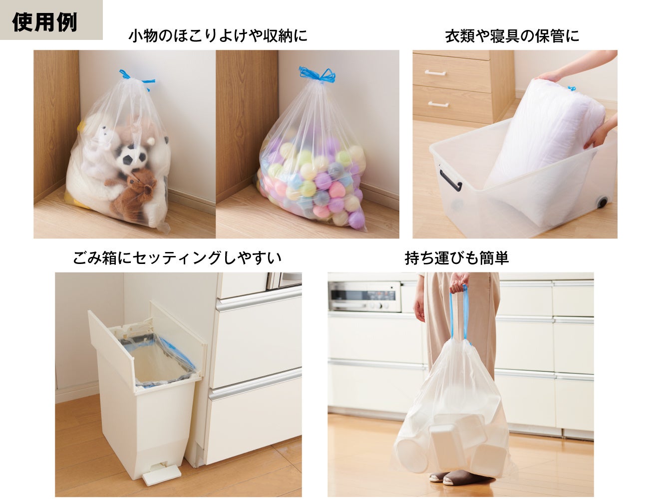 「結びひも付きポリ袋」は、ひも付きで開け閉めが簡単にできることから、衣服の収納・おもちゃ等の整理に利用できます。ごみ袋としても、ひもで開口部をしっかり閉じることができるため、捨てた後の内容物の散乱などの心配がなくなり安心です。