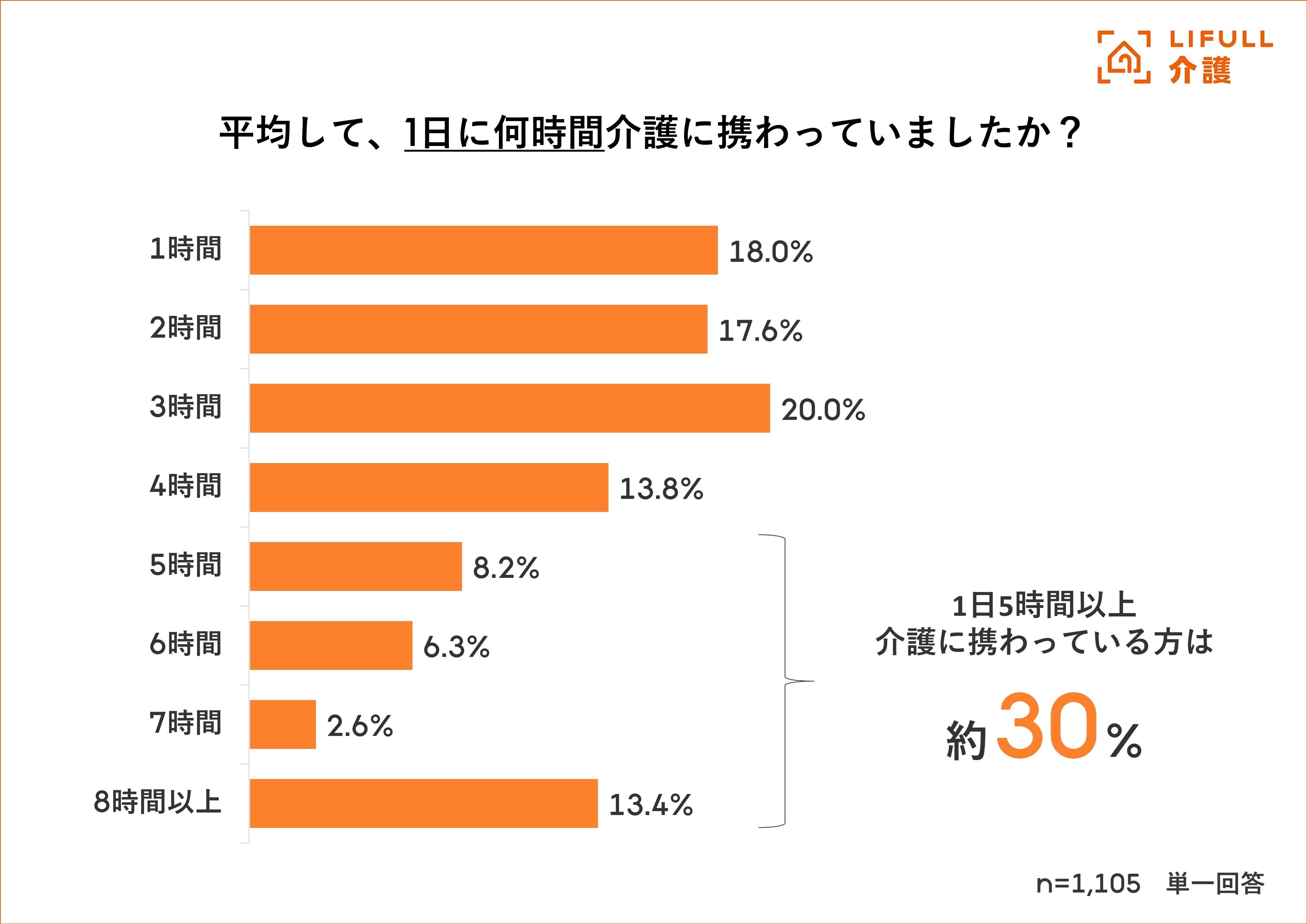 一日のうち、介護の時間は3時間までが半数以上。一方で「5時間以上」も約30%