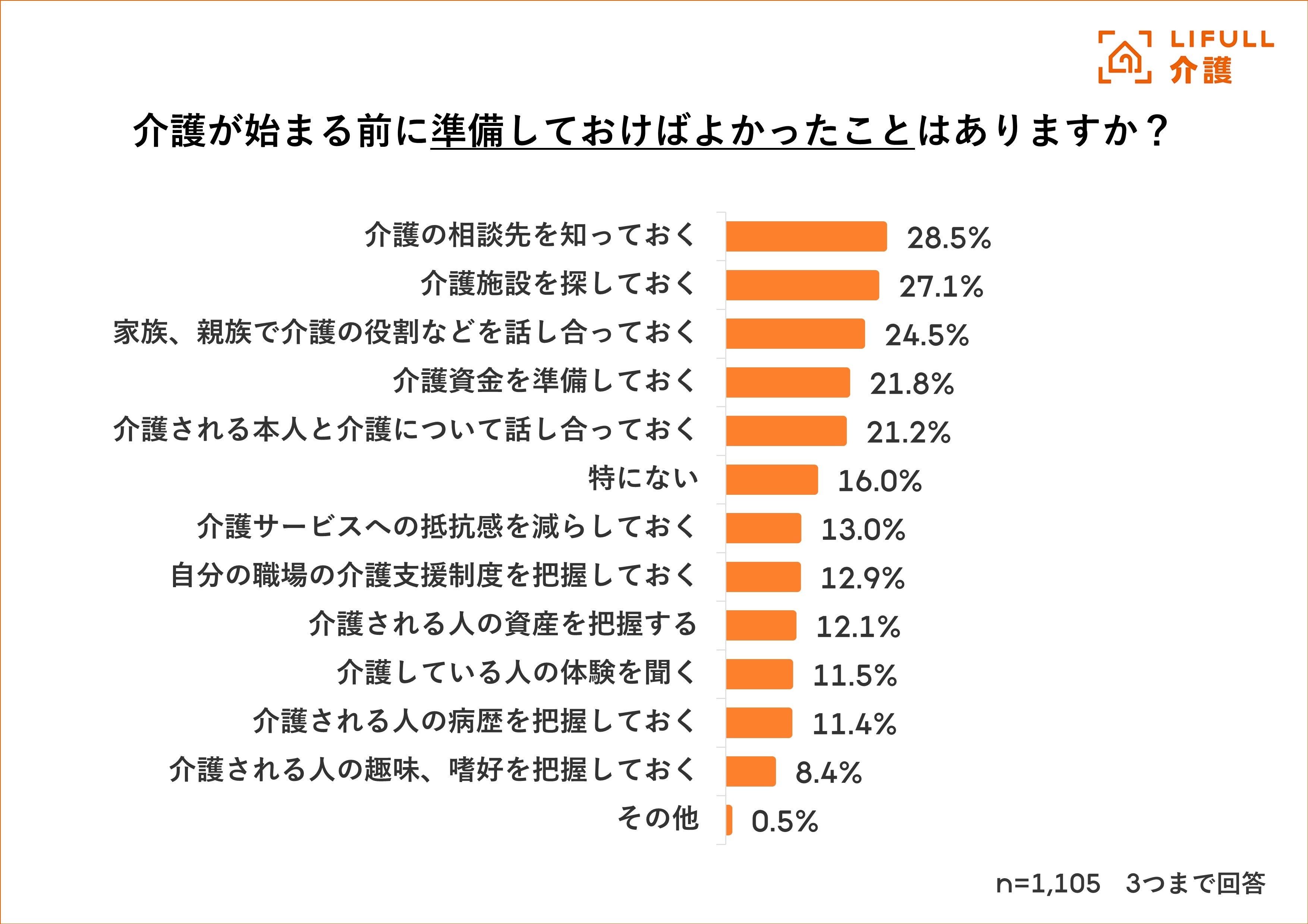 介護を経験した人に、介護が始まる前に準備しておきたかったことをたずねたところ、1位は「介護の相談先を知っておく」(28.5%)でした。次いで「介護施設を探しておく」(27.1%)も票を集めました。