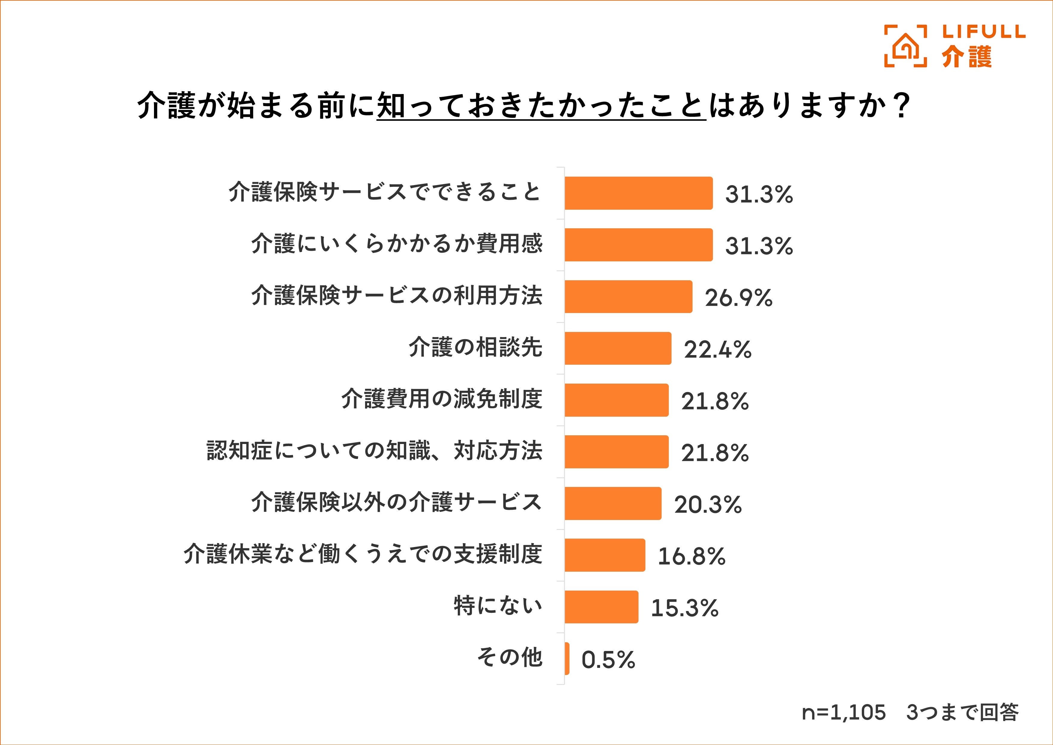介護を経験した人が、介護が始まる前に知っておきたかったことで最も票を集めたのは「介護保険サービスでできること」と「介護の費用感」(どちらも31.3%)でした。