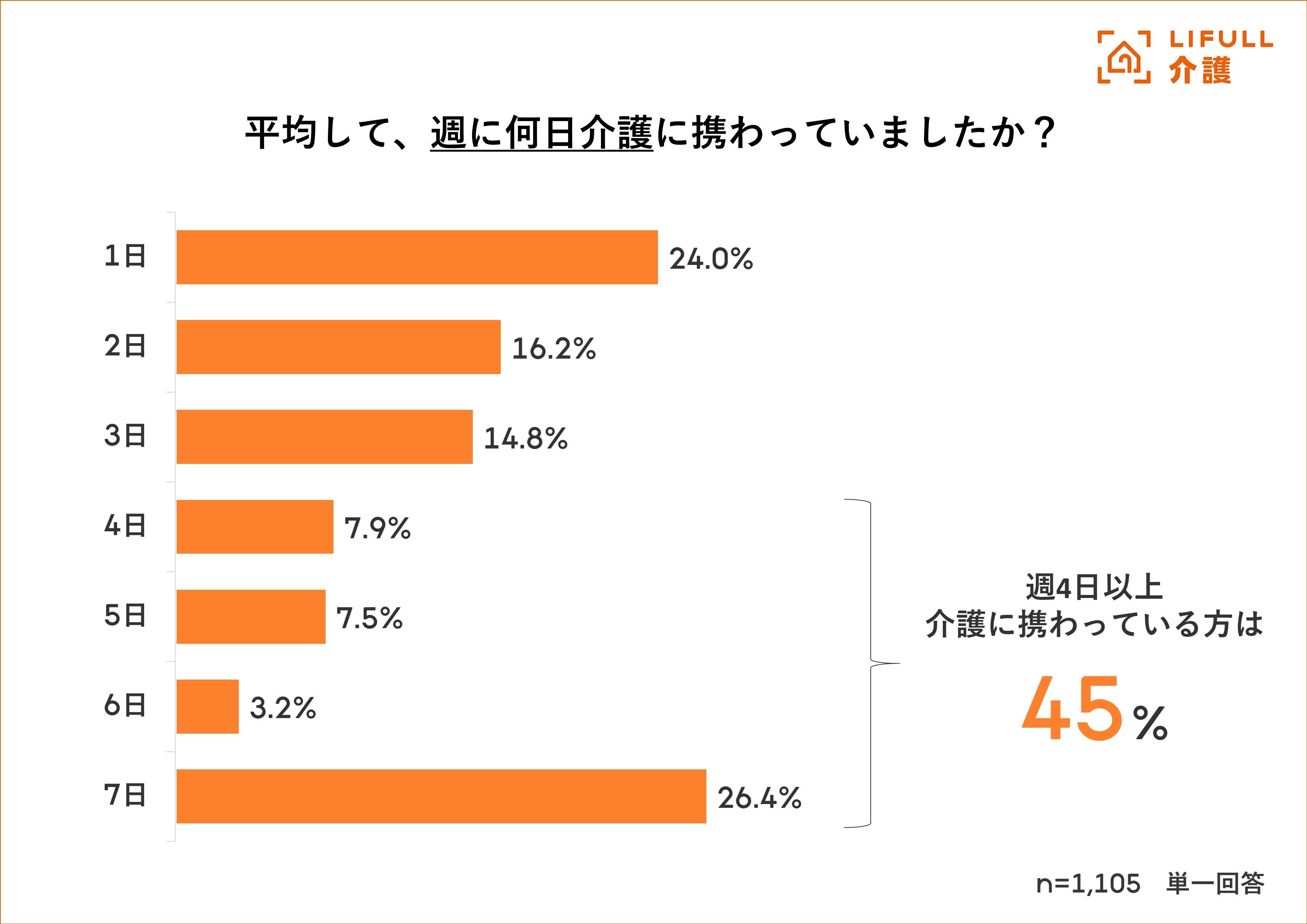 一番多かった回答は「週7日」(26.4%)でした。週4日以上と回答している方は全体の45%を占めています。介護が必要な方と同居していると、切れ目なく介助や見守りが必要になるため、毎日のように介護に携わっているのは、珍しい状況ではないことが伺えます。