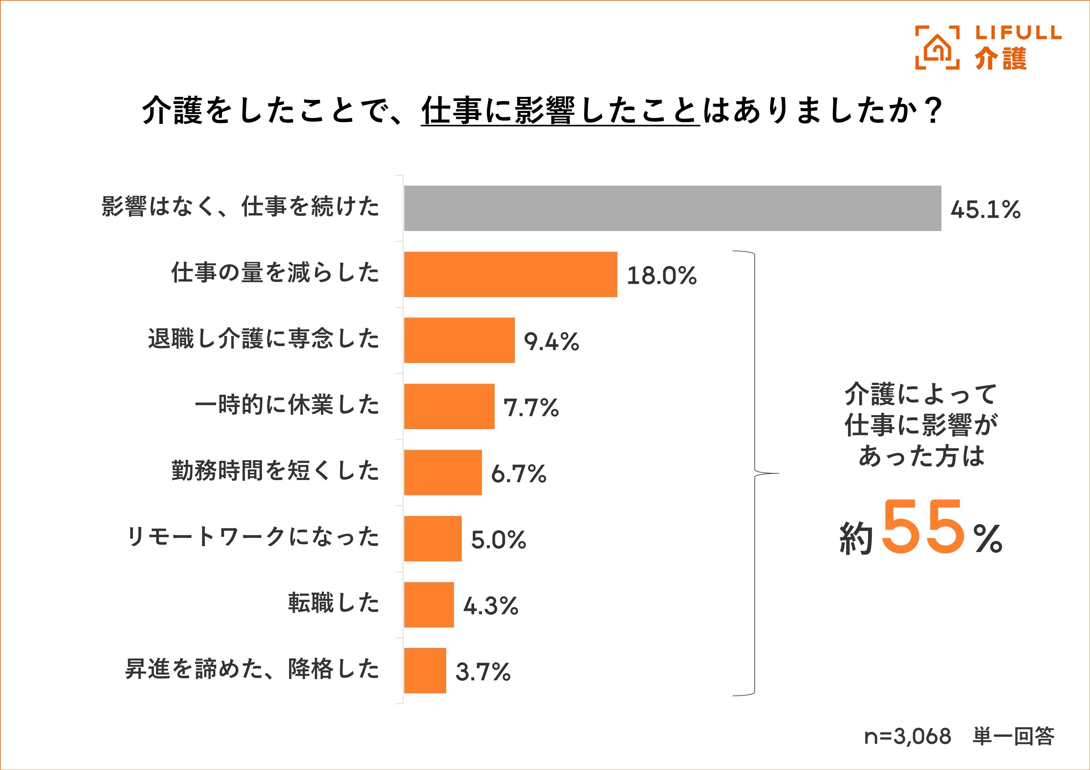 仕事をしながら介護を始めた人のうち、仕事に何らかの影響があった方は約55%と、半数以上にのぼる結果となりました。なかでも多かったのは「仕事の量を減らした」で18%です。次いで「退職し介護に専念した」が9.4%となっており、介護離職を選択することは珍しくないことがわかりました。
