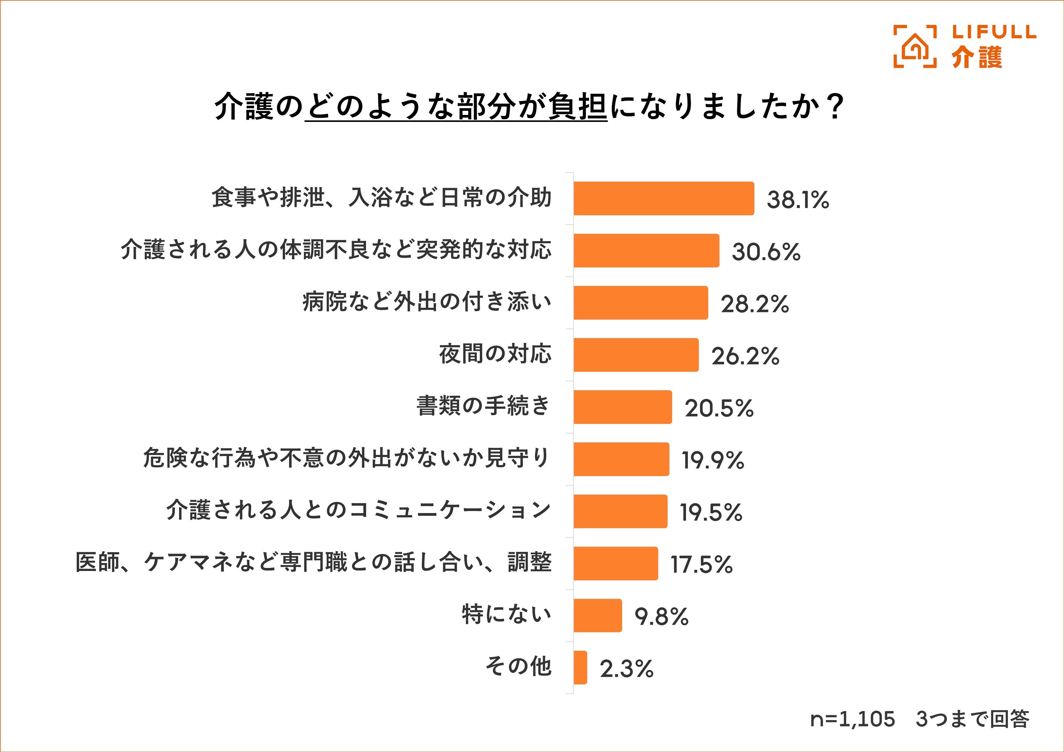 介護のどのような部分が負担だったかをたずねると、最も多かったのは「食事や排せつ、入浴など日常の介助」(38.1%)でした。次いで「介護される人の体調不良など突発的な対応」(30.6%)、「病院など外出の付き添い」(28.2%)となりました。