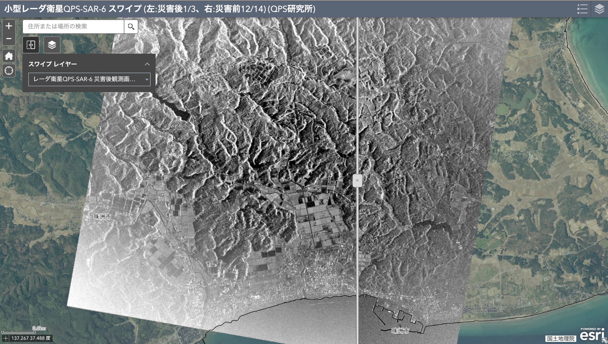 掲載ページ内では、右側に以前2023年12月14日13:17にQPS-SAR6号機が石川県珠州市を観測していた画像、左側には、同じくQPS-SAR6号機が災害発生後の2024年1月3日13:19に同エリアを観測した画像が掲載されています。マップ上のスライダーを左右に動かすことで比較して見ることができます。ページ内で画像は拡大することができ、土砂崩壊箇所など確認できます。
