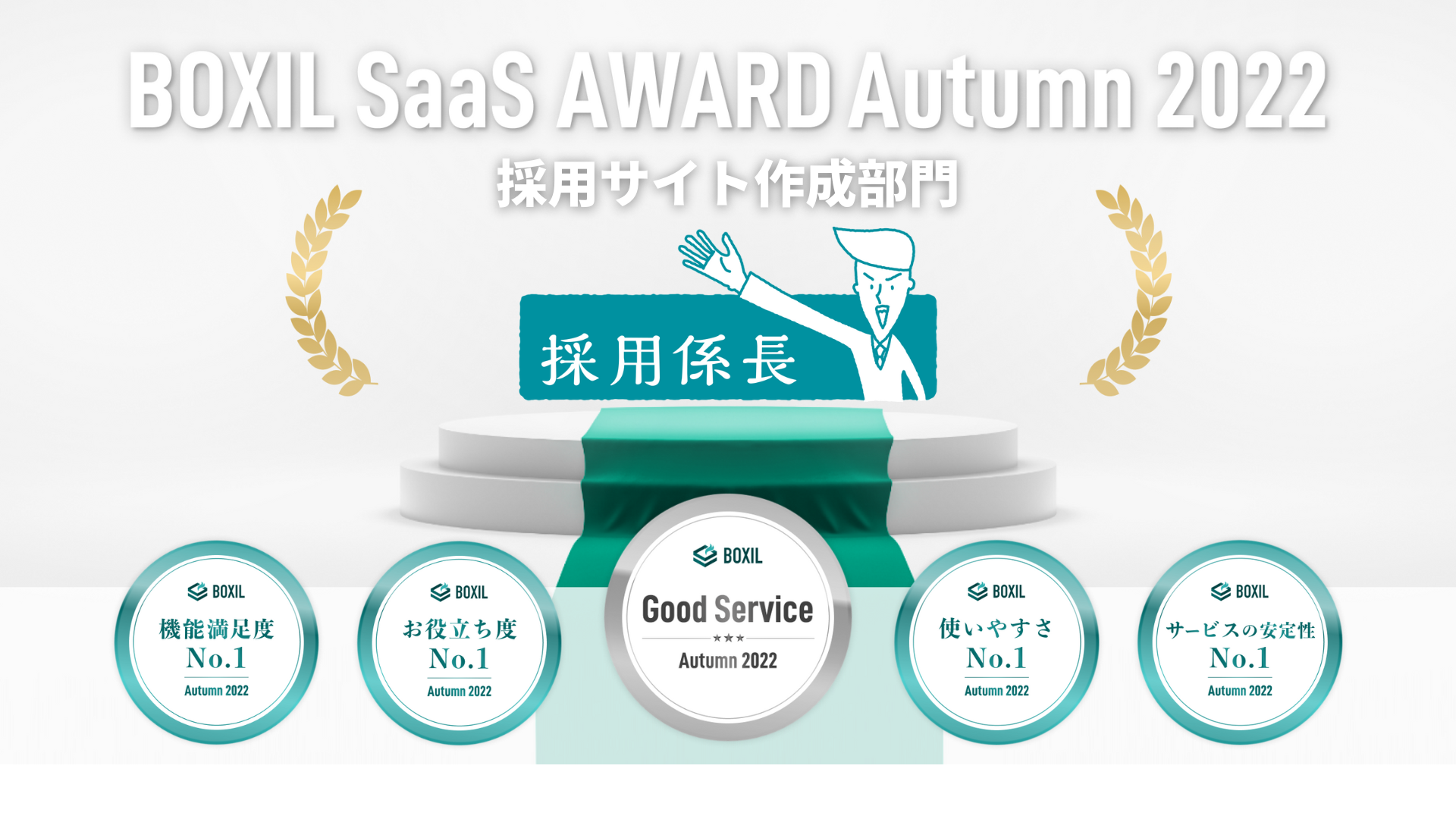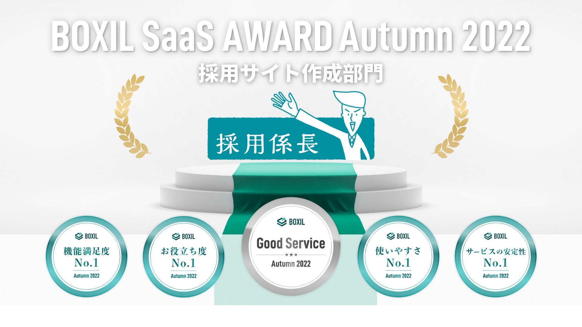 この度、数あるサービスの中から「BOXIL SaaS AWARD 2021 Autumn」、「BOXIL SaaS AWARD 2022」に続き、採用サイト作成部門において採用係長が連続受賞をいただいたこと、大変光栄に思います。