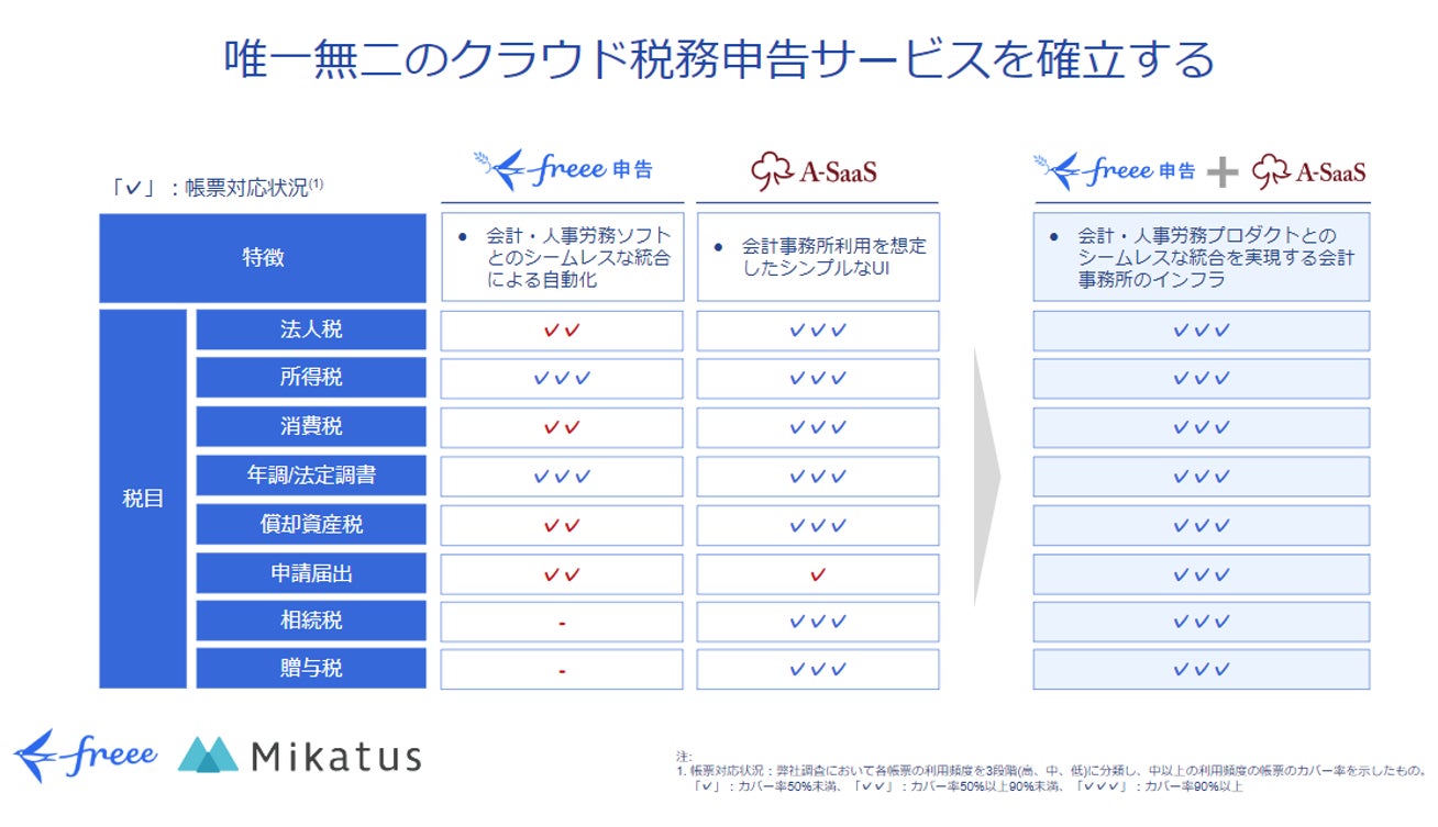 これまでfreeeが提供してきた統合型クラウドERPサービスに、Mikatus(ミカタス)が提供する会計事務所のためのクラウド税務・会計・給与サービスおよびノウハウが加わることで、会計事務所とその顧問先であるスモールビジネスのクラウド化を推進して、利便性向上を目指します。