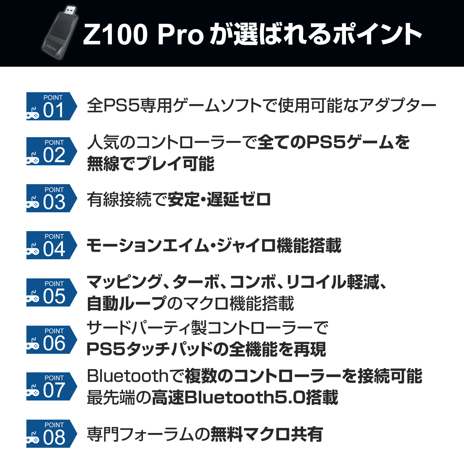 PS5のコントローラーの形、重量が違うので操作に違和感があり、慣れない方が多いです。しかし、Z100ProではPS4コントローラーが使えるので、PS5をいつも通りの操作感でプレイできます。PS5版ゲームをPS4のコントローラーでプレイしたい方はZ100Pro一択です。