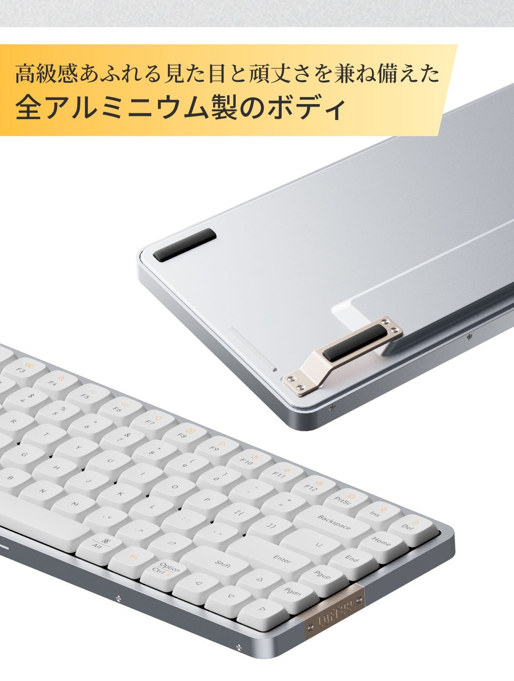 全体がアルミニウム製のボディで作られたLofree Flowは、高級感あふれる見た目と頑丈さを兼ね備えています。美しいデザインと耐久性を求めるあなたにピッタリ。お部屋に置いてあるだけでも目を引く存在感、でもただの見た目だけじゃない、その耐久性にも注目です。しっかりとした作りで、長くご愛用いただけます。