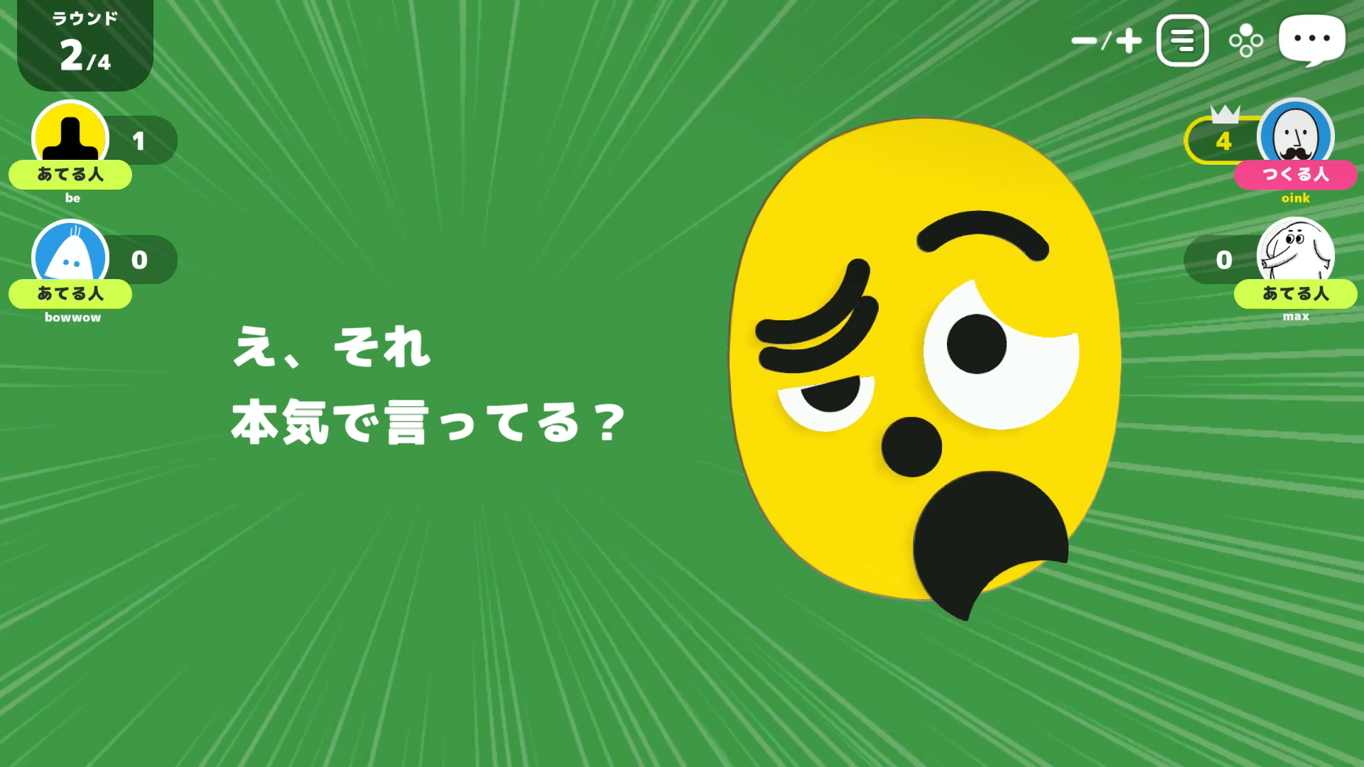 2022年春に無料アップデート予定。お題カードのセリフにあわせ、パーツを組み合わせて顔を作り、他のプレイヤーがセリフを当てるパーティーゲーム。