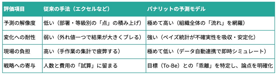 パナリットは、要員計画を単なる「点(定員数)」の積み上げではなく、動的な「網(組織内の人員流動)」として捉えることで、予測精度を飛躍的に向上させました。