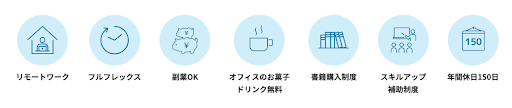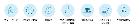 アジャイルウェアは創業当初から『フルフレックスタイム制度』、『リモートワーク』、『オフィスのお菓子ドリンク無料』、『副業OK』など、従業員が働きやすい制度を多数導入しています。