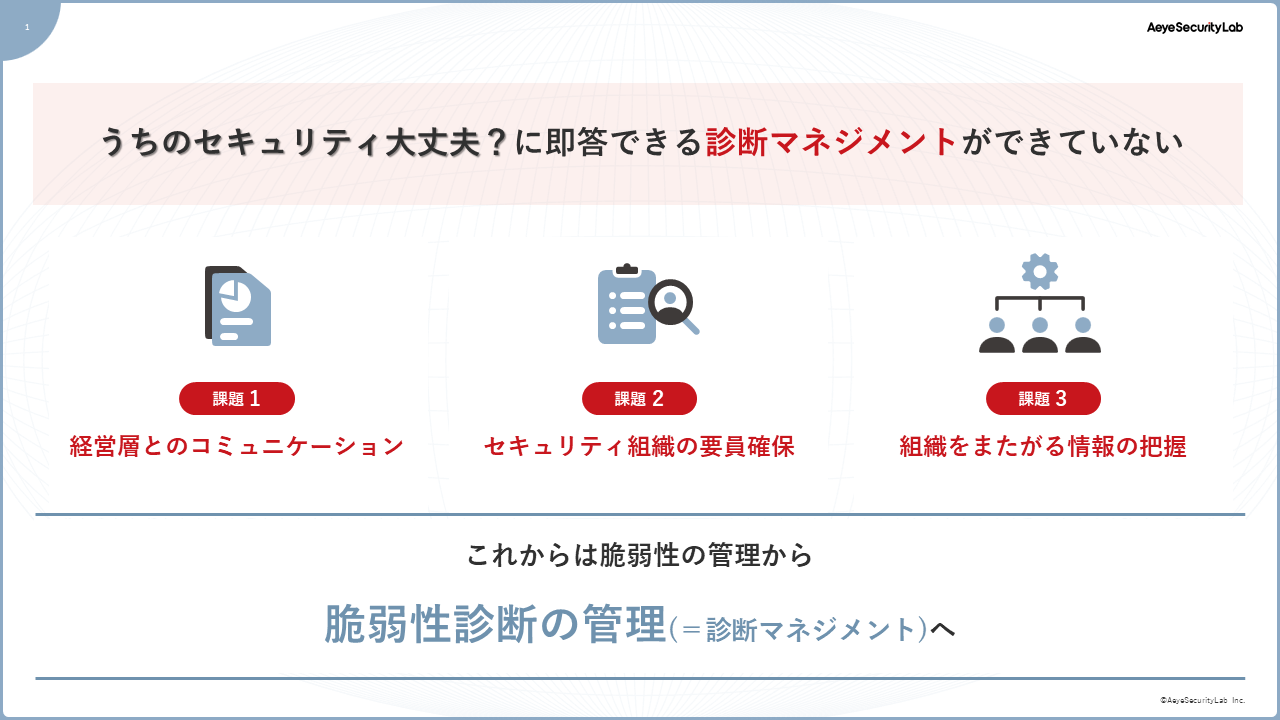 「うちのセキュリティ大丈夫?」に答えるには、対策状況を把握し、経営に分かる言葉で伝える必要があります。ただ、脆弱性診断の状況把握にはいくつかの課題がありました。