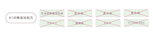 * 石油系界面活性剤、パラベン、着色剤、鉱物油、漂白剤、光沢剤、タルク、マイクロカプセルすべて無添加