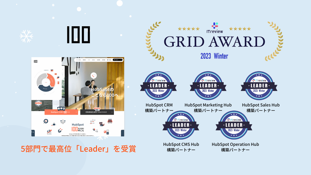 HubSpotを活用したRevOpsソリューションを提供する、株式会社100(ハンドレッド)が、「ITreview Grid Award 2023 Winter」5部門の最高位「Leader」を受賞