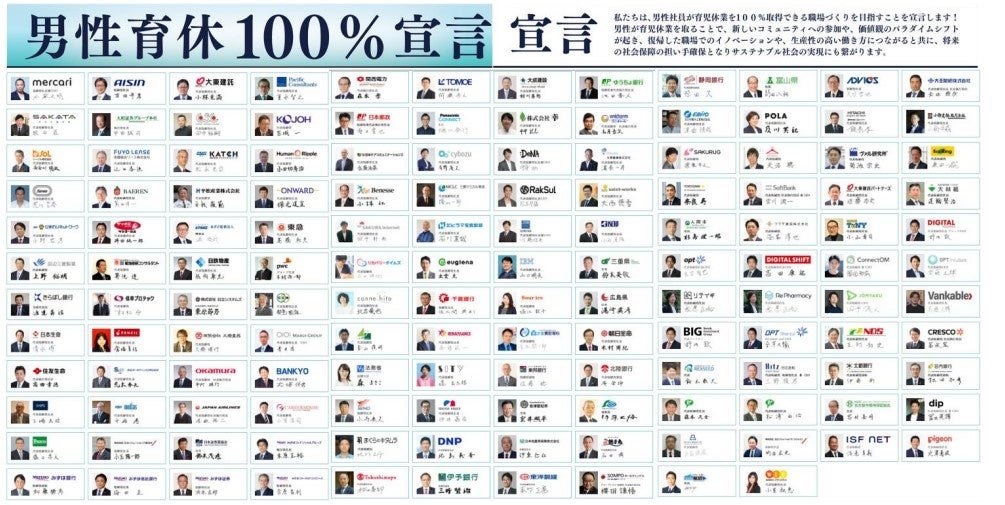 当社が 2019 年 3 月より募集を開始した企業・組織の代表者による宣言で、「現在、自社内で男性の育 児休業取得率 100%の実現を目指して取り組んでいる」組織および「今後、取得率をあげて、いずれは 100%を目指したい」組織により構成されるものです。企業規模や現在の取得状況などは問わず、将来 的に男性であっても育児休業が取得しやすい環境の実現に経営者としてコミットすることを明示するためのもので、2022 年 9 月 2 日の時点で 142 社の宣言が集まっています。