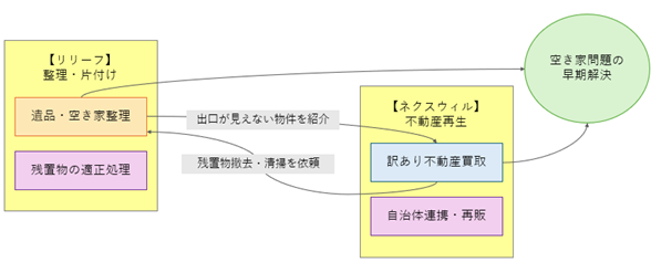 年間12,000件のご相談実績と500社以上の法人提携を持つリリーフと、空き家対策や二地域居住推進を軸に自治体との連携実績も多数ある、訳あり不動産の再生に強みを持つネクスウィルが連携することで、空き家問題の「整理」と「出口」のミスマッチを解消し、これまで流通が困難だった物件に新たな価値を与えることで、所有者の負担軽減と地域活性化を目指します。