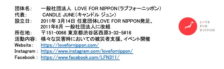 一般社団法人 LOVE FOR NIPPON(本社:東京都渋谷区、代表:CANDLE JUNE)は、東日本大震災を受けて立ち上がりました。「できることは全部やる」を掲げ、キャンドルジュン自ら現地に足を運び