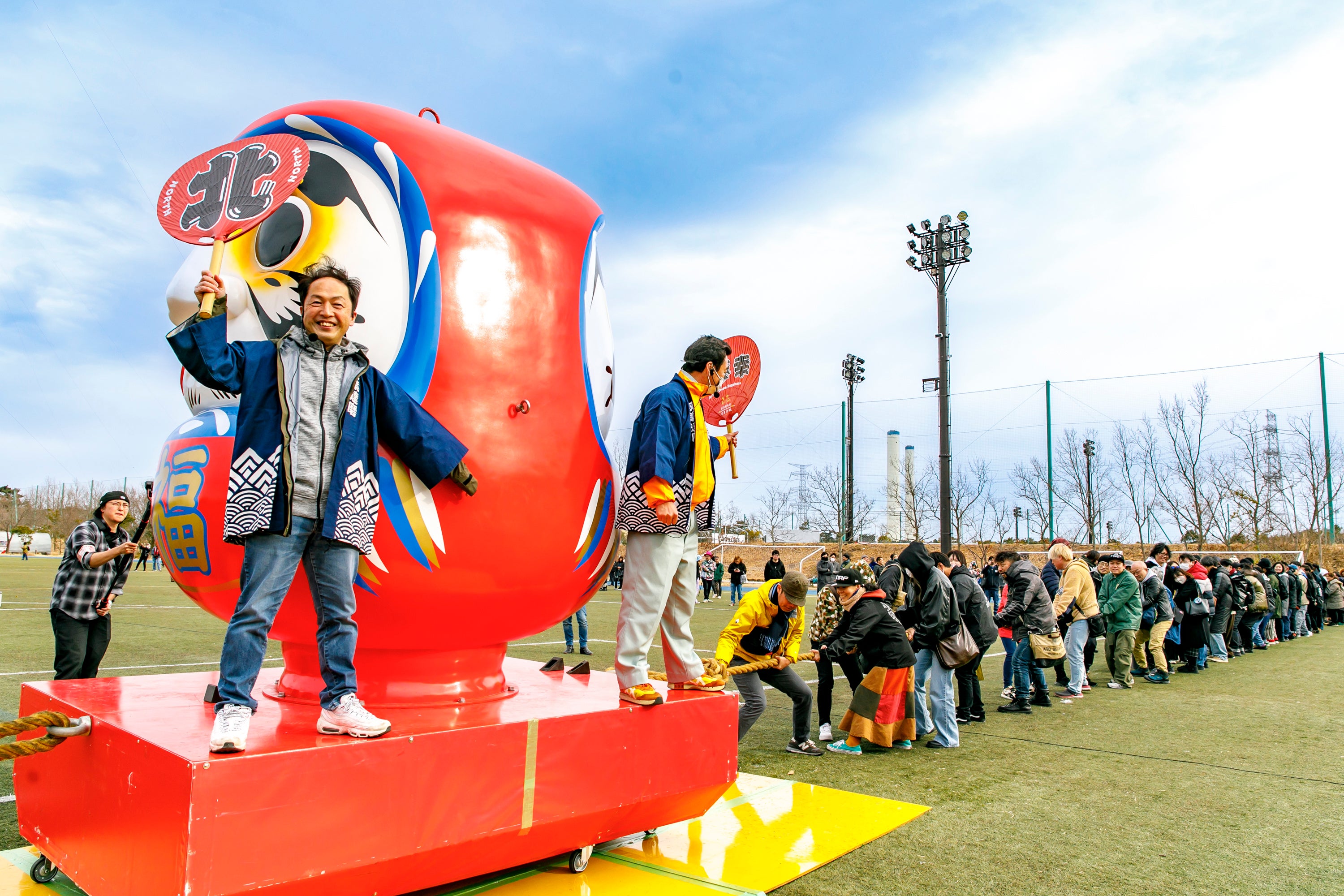 Jヴィレッジに集結して開催されるだるま引き合戦は、感動とともにみんなを笑顔にしてくれます。