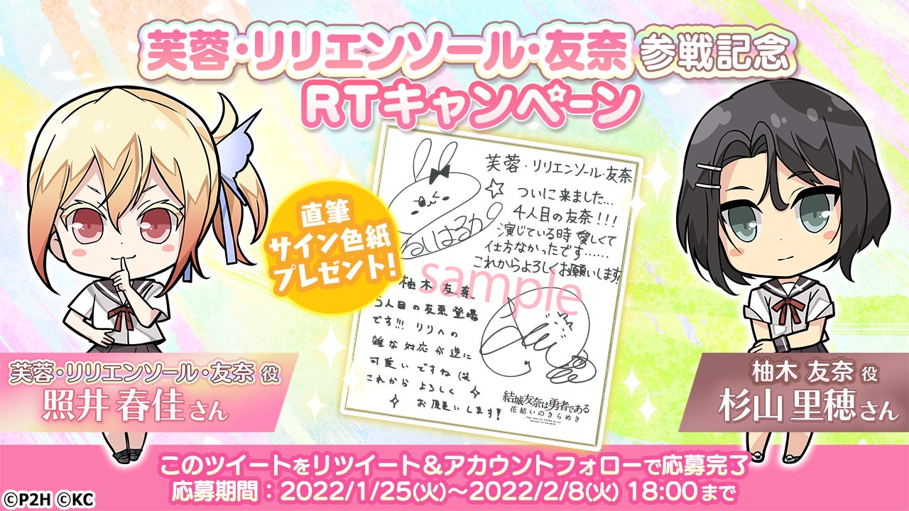 『ゆゆゆい』公式Twitterをフォロー&該当ツイートをリツイートすることで、芙蓉・リリエンソール・友奈役の照井春佳さんと柚木友奈役の杉山里穂さんサイン色紙プレゼントへの応募が出来ます。