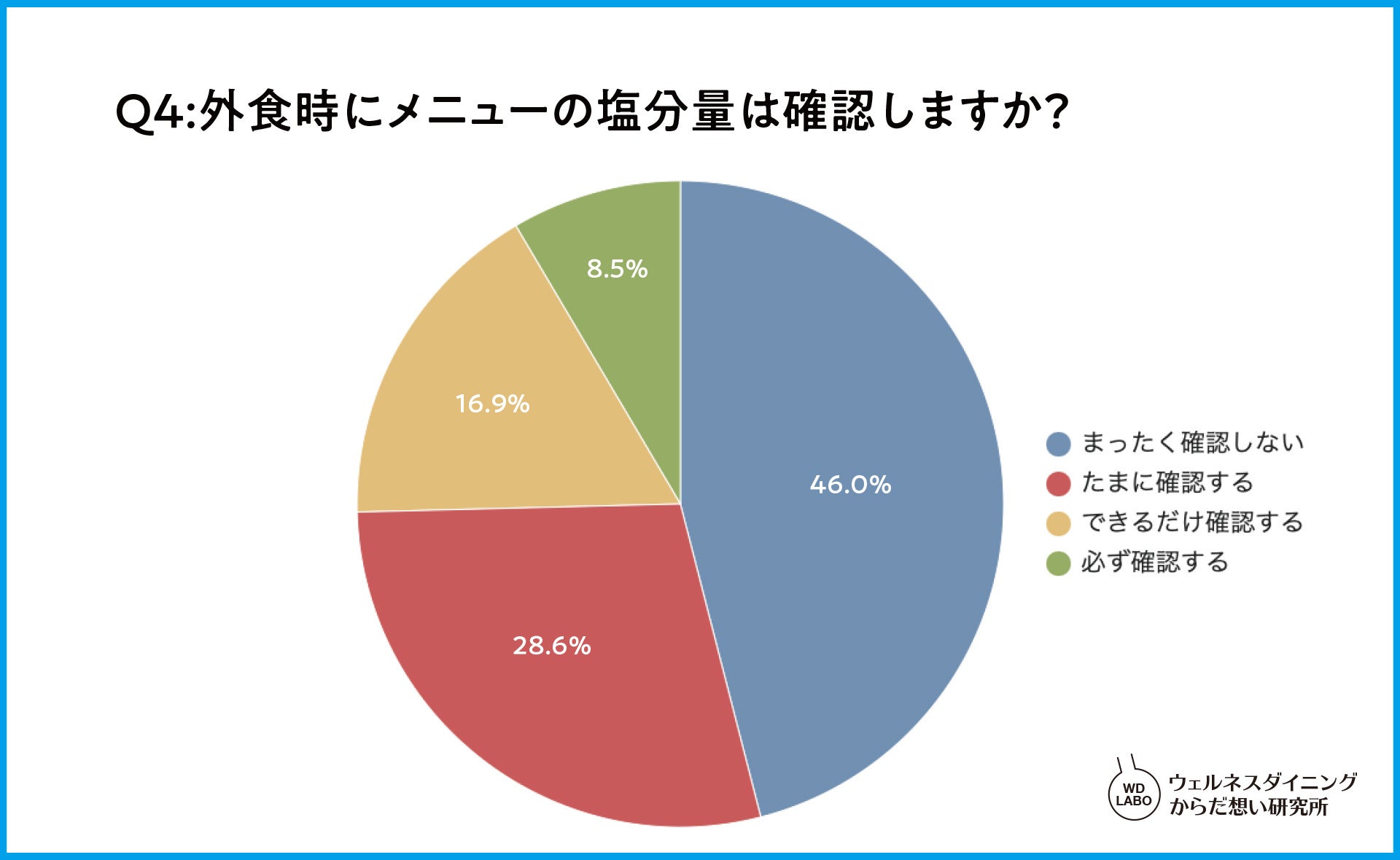 ✓ 46.0%が外食時に食べるメニューの塩分量を「まったく確認しない」と回答