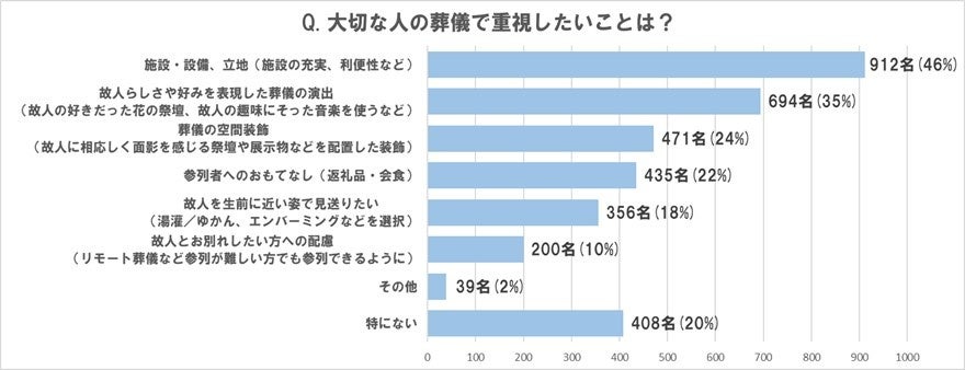 大切な人の葬儀で重視したいことは、1位「施設の充実、利便性」46% 2位「故人らしさや好みを表現した演出」35%、3位「葬儀の空間装飾」24%と 従来の葬儀にとらわれず故人によりそった演出・装飾を重視する人が多数存在する |