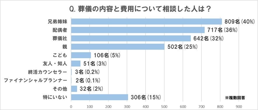 葬儀の内容と費用について誰かに相談した人は85% 相談相手は、1位「兄弟姉妹」40%、2位「配偶者」36%、3位「葬儀社」32% |