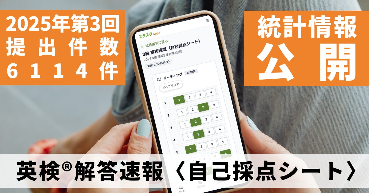 スタディスタジオ株式会社(本社:東京都渋谷区、代表取締役:鈴木孝一)は、英検®学習支援Webアプリ「スタスタApps」が提供する「英検®解答速報〈自己採点シート〉」について、2025年度第3回試験における利用動向(提出件数)を集計し、公開します。