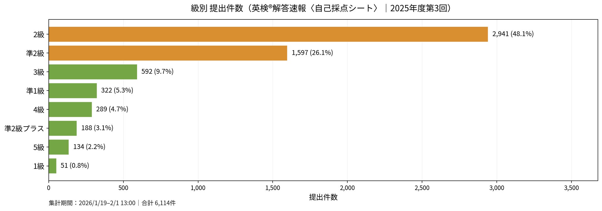 今回の集計では、自己採点結果を確定(提出/保存)した件数が合計6,114件となりました。利用は2級・準2級に大きく集中しており、運用・改善の優先度が明確に見える結果となっています。