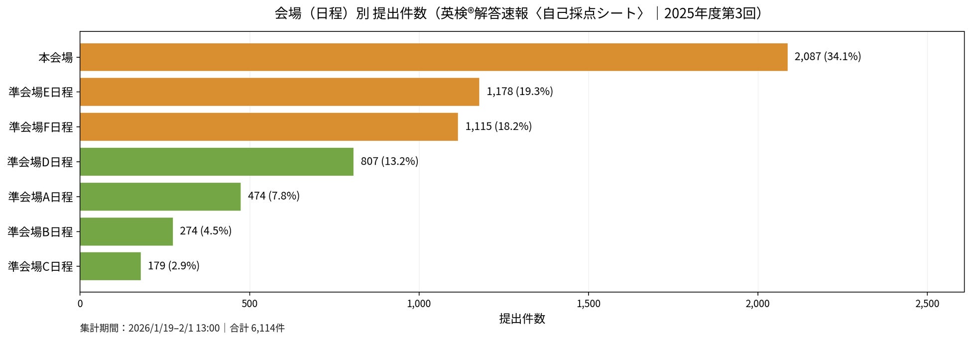 会場(日程)別にみると、本会場(2,087件)に加え、準会場E(1,178件)・準会場F(1,115件)の比率が高く、本会場+準会場E+準会場Fの合計は4,380件で全体の71.6%を占めました。