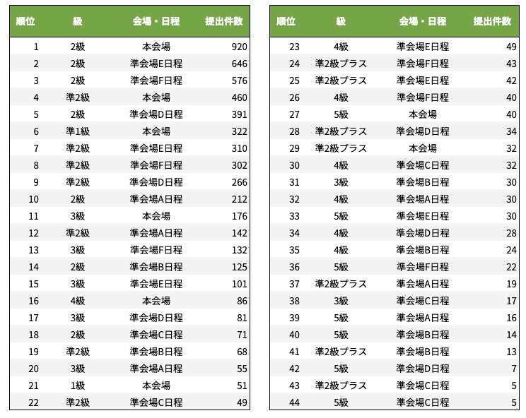級別の提出件数を合計すると、2級が2,941件、準2級が1,597件となり、2級+準2級の合計は4,538件で全体の74.2%を占めました。