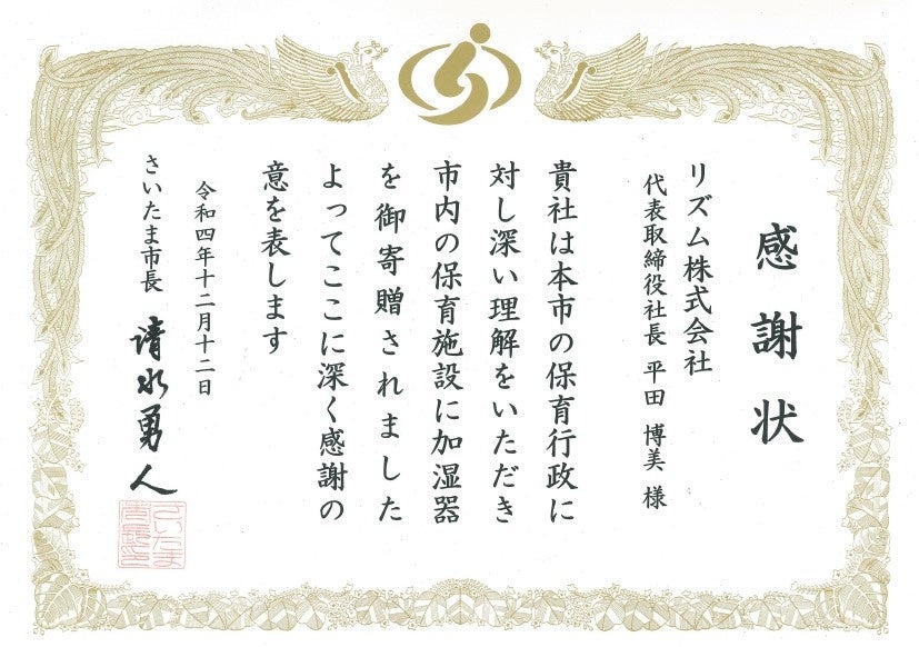 リズム株式会社(取締役社長 平田博美)は、子どもの育成支援を通じた地域社会への貢献の一環として、『埼玉りそな寄贈型CSR 私募債』を活用し、株式会社埼玉りそな銀行と連名で、さいたま市の地域型保育事業所125施設に当社製加湿器『MIST 300』を寄贈しました。また、12月12日(月)さいたま市役所において贈呈式が実施され、さいたま市長への寄贈目録の贈呈、さいたま市長からの感謝状の授与が行われました。