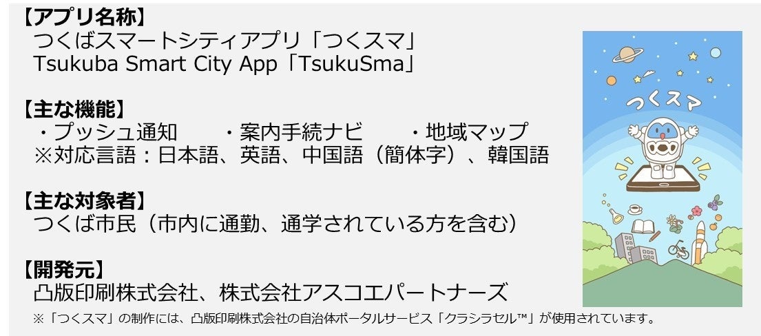 本アプリは、つくばスマートシティ協議会の事業の一環として、つくば市、凸版印刷株式会社(本社:東京都文京区、代表取締役社長:麿 秀晴)、株式会社アスコエパートナーズ(本社:東京都港区、代表取締役社長:安井 秀行)の3者により共同開発したもので、お住まいの地区や年代、家族構成、受け取りたい情報の種類などを登録(任意)すると、その設定条件に応じた情報がプッシュ配信されるほか、各種行政手続きや地図情報等を簡単に探すことができます。また、約140の国・地域の方が生活する国際性・多様性を有するつくば市の特性を踏まえ、多言語表示にも対応しています。