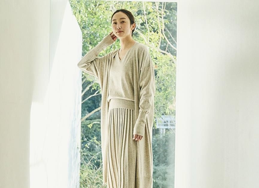 長めの着丈のロングカーディガンは敢えてボタンを付けずに、ラフに羽織れるデザインインしました。袖口のリブは長めにしているので、お好みのバランスで折り返して着用していただけます。