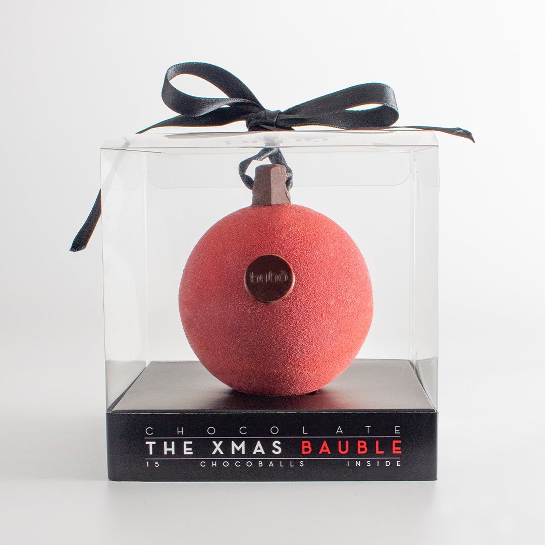 クリスマスツリーのオーナメントをモチーフにした、情熱的な深紅のダークチョコレート